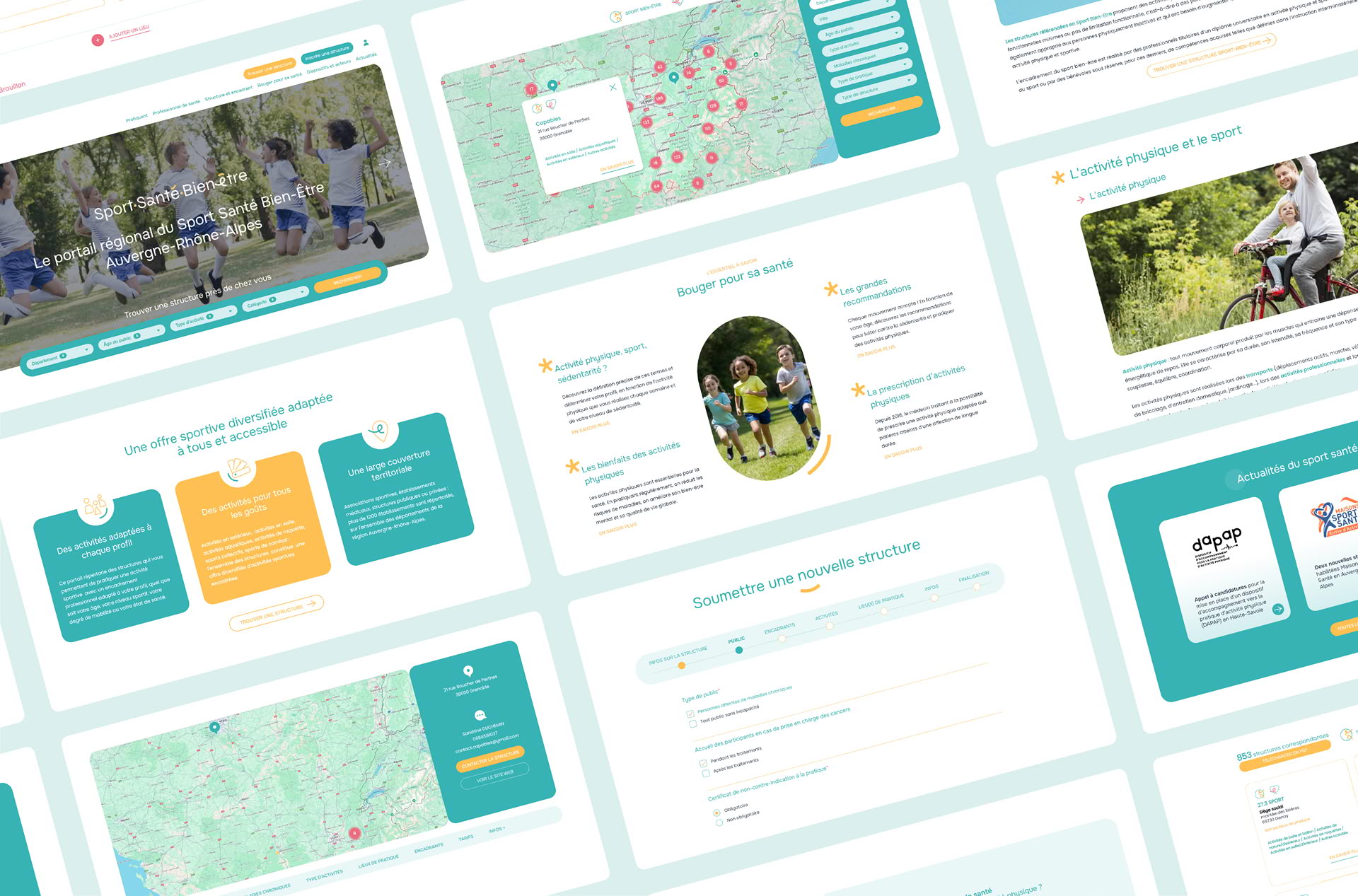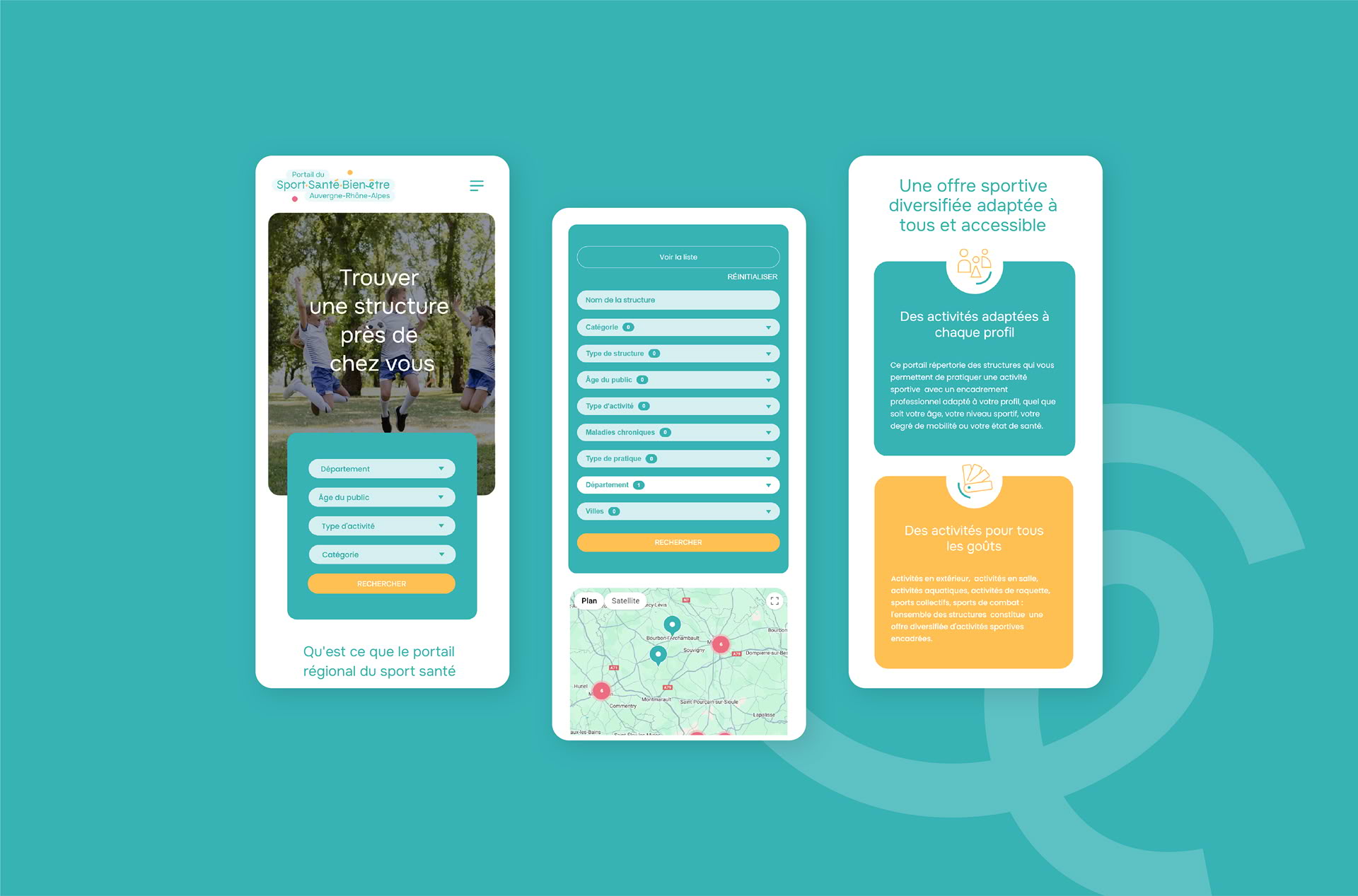 Le portail devait permettre aux structures de s’inscrire en ligne, aux instances de valider les informations via un back-office sécurisé, et aux utilisateurs finaux de trouver facilement une offre adaptée à leurs besoins grâce à des critères précis (localisation, public, pathologies, types d’activités).