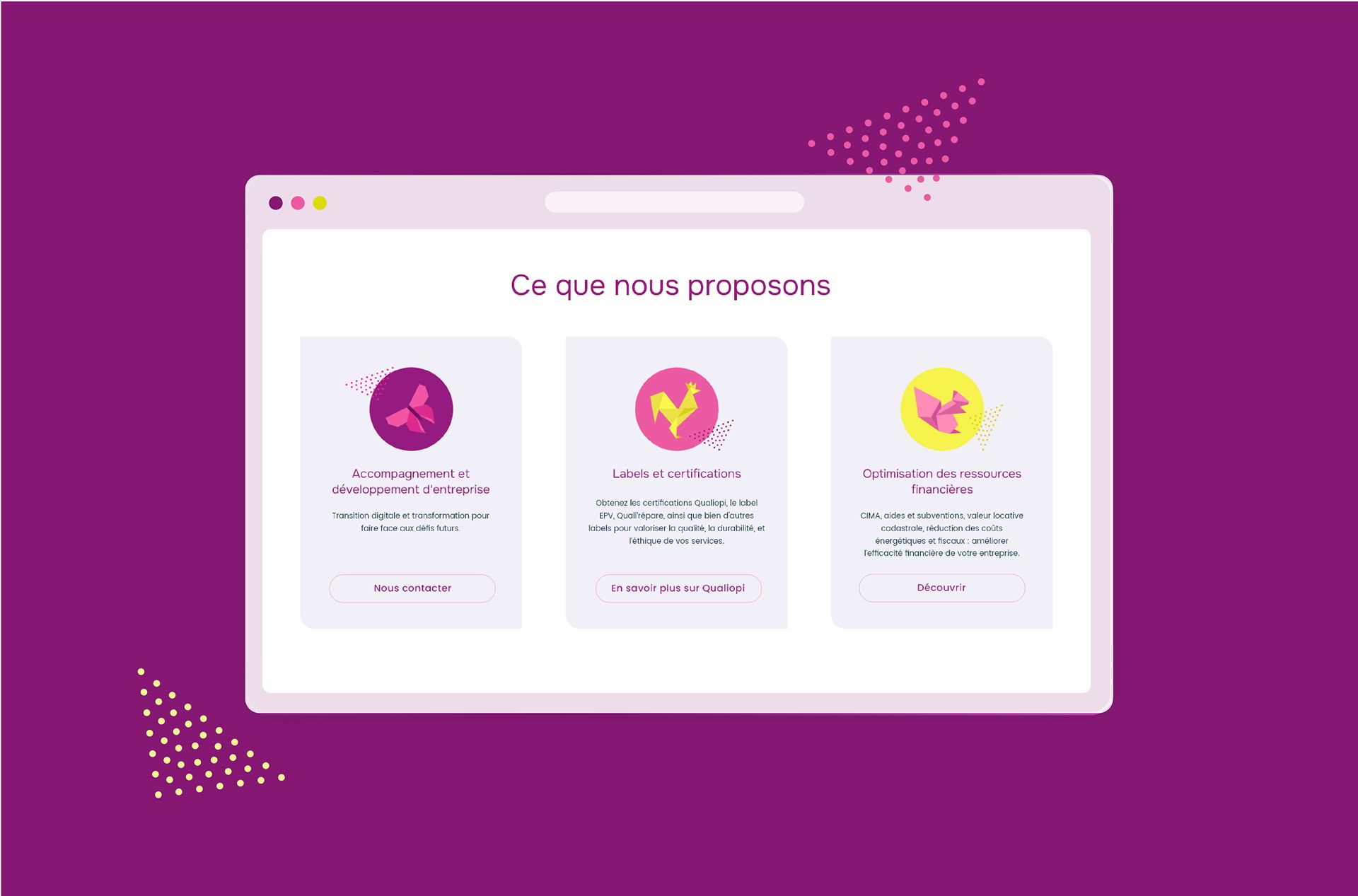 Il s’agissait de structurer un univers graphique plus mature et plus lisible, tout en travaillant la hiérarchisation des services et la clarté du message.
