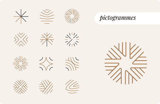 Nous avons conçu une série de pictogrammes pour évoquer à la fois l’univers du design et la matière bois. Pensés comme des marqueurs visuels identitaires, ils enrichissent l’univers de marque en apportant cohérence et singularité.