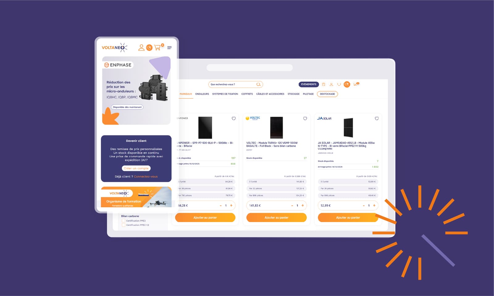 Voltanéo a engagé un projet structurant visant à faire du digital un véritable levier de performance commerciale et opérationnelle. L’enjeu dépassait largement la création d’un site e-commerce classique : il s’agissait de concevoir un outil de vente en ligne entièrement connecté à l’ERP Odoo, capable de gérer des contraintes métiers fortes, tout en offrant une expérience utilisateur fluide et maîtrisée.